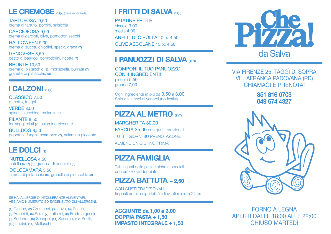 Che Pizza! da Salva is a vibrant takeaway spot located in Via Firenze, Taggi di Sopra, Italy, where pizza lovers find a blend of tradition and creativity. The menu offers a range of classic and inventive pizzas like the simple yet flavorful Marinara (€4.00) and the rich Bufalina (€8.00) topped with fresh buffalo mozzarella. Each pizza stands out for its light, well-leavened dough, ensuring a perfect balance of crispness and softness—a detail much appreciated by regulars.
